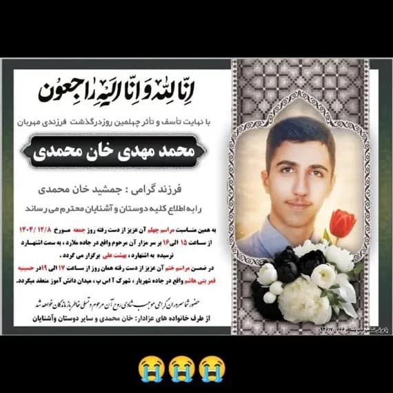 محمدمهدی_خان_محمدی، متولد ۱۵ دی ۸۵، پیک موتوری، در ۱۸ دی ۱۴۰۴ در کرج هنگام کمک به مجروحان از پشت سر مورد اصابت گلولهی مزدوران خامنهای قرار گرفت و...